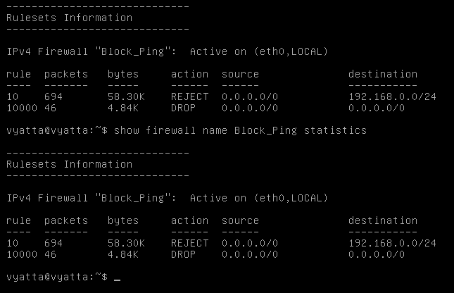 I decided to setup a simple firewall on my Vyatta VM router to block pings from another VM Host (Ubuntu 12.04). The network is entirely in the range 192.168.0.100/24. The Ubuntu Host IP is 192.168. 192.168.0.111